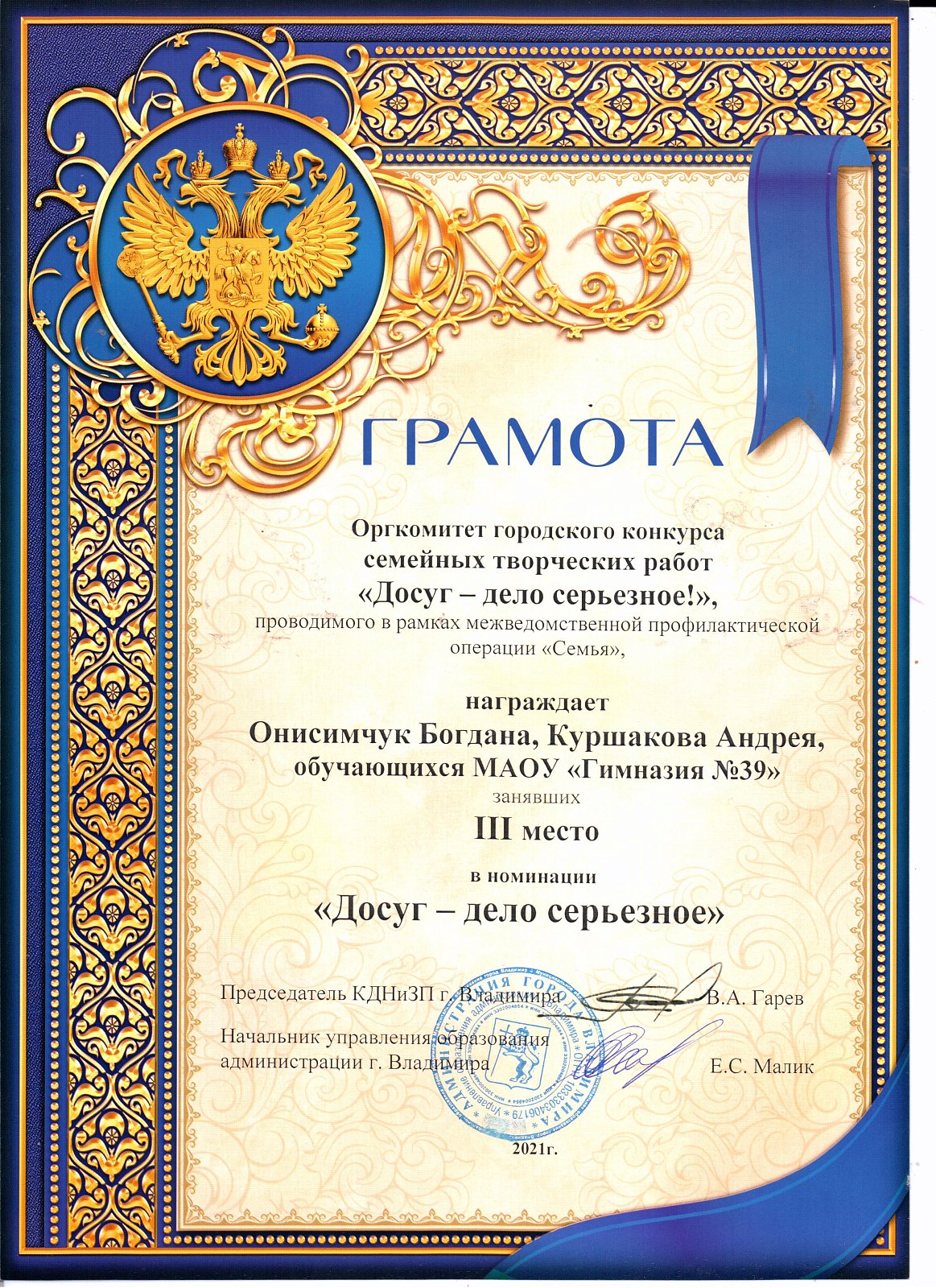 Онисимчук Богдан Валерьевич, Куршаков Андрей МАОУ «Гимназия № 39» |