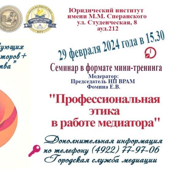"Профессиональная этика медиатора" - новая тема семинара в формате мини-тренинга, который состоится 29 февраля 2024 года в рамках встреч Клуба практикующих школьных медиаторов+.