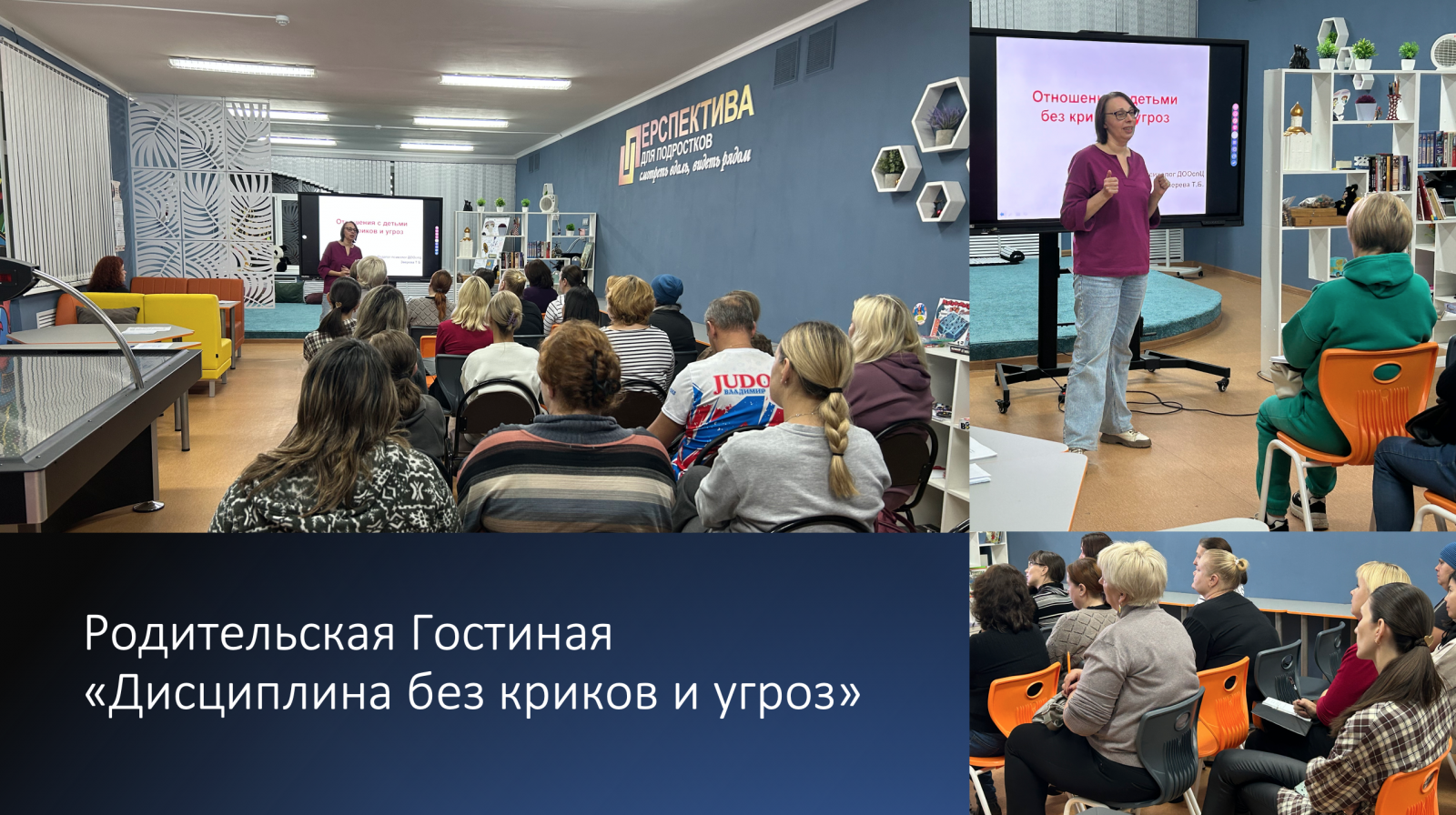 В рамках реализации мероприятия «Родительская гостиная» 15 декабря на базе МБУДО «ДООспЦ» в муниципальном подростковом центре «Перспектива» состоялась очередная встреча на тему «Дисциплина без криков и угроз». К нам в гости пришли родители из шести образовательных организаций города Владимира (СОШ № 28, № 34, № 35, № 36, № 38, № 49).